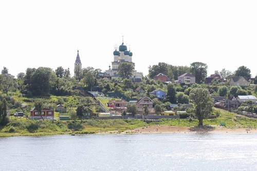 Có lúc tàu đi qua thị trấn cổ, bạn sẽ không khỏi trầm trồ khi nhìn thấy rất nhiều nhà thờ với lối kiến trúc đa dạng nằm hai bên bờ, vừa uy nghiêm, vừa duyên dáng soi mình xuống dòng sông. Có chỗ lại là cả bãi tắm dài hàng cây số như một bãi biển thực sự. Ấn tượng nhất là ở những khúc quanh, đứng dưới đuôi tàu, bạn có thể ngắm tàu bạn màu trắng từ từ hiện ra nơi dòng sông, uốn mình giữa hai bên bờ cây xanh thẫm, trên là bầu trời xanh lơ, trăng tròn treo lơ lửng, phía đối diện mặt trời vẫn tỏa tia nắng chiều rực rỡ, mặt nước lóng lánh như dát vàng. Lòng ngân lên câu hát năm xưa “Volga biếc xanh chìm đắm trong sương chiều. Dòng uốn quanh. Nắng in đôi bờ...”Sự hòa quyện giữa màu xanh của nước, cây cối và mây trời trong những ngày tháng 7.