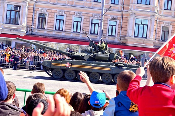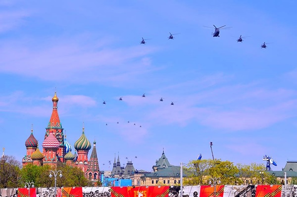 Lễ duyệt binh còn có sự tham gia của không quân với hàng chục máy bay như trực thăng Mi-26T, máy bay vận tải lớn nhất thế giới An-124 Ruslan, siêu tiêm kích đánh chặn Mig-31, tiêm kích hạng nặng Su-35, Su-30 SM, máy bay ném bom siêu âm Tu-160,...