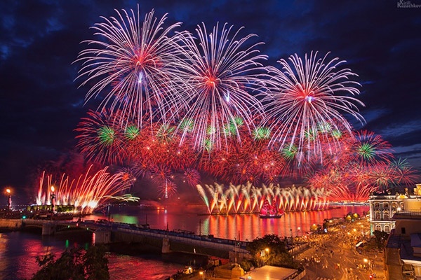 Bầu trời Saint Petersburg sáng hơn với màn pháo hoa đủ màu sắc và dàn nhạc nước cùng ánh đèn lazer hoàng tráng.
