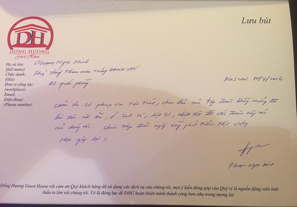 Vì những lý do trên, trong nhiều năm liền, nhiều phái đoàn từ cơ quan và các Bộ, Ban, Ngành trong nước, các nghệ sỹ có tên tuổi như Mỹ Linh, Thu Phương, Bằng Kiều, Tuấn Hưng, MC Lại Văn Sâm, MC Diễm Quỳnh,...đã lựa chọn NHÀ KHÁCH ĐỒNG HƯƠNG làm chỗ lưu trú trong suốt thời gian công tác và nghỉ ngơi tại Matx-cơ-va. Đó là vinh dự lớn đối với chúng tôi.
