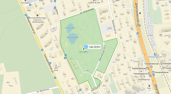 Nằm tại địa chỉ: ул. Немчинова, м. Тимирязевская (xem trên bản đồ) và cho đến hiện nay, công viên đang nằm trong kế hoạch được xây dựng các mạng lưới đường giao thông để đi vào. Tuy nằm cách xa so với đường Quốc lộ, nhưng lại là nơi có cảnh quan rất thoáng mát, không khí trong lành, mát mẻ, do vậy hàng ngày trong khu vườn này thu hút nhiều người dân đến vui chơi. Hai hồ nước lớn được thiết kế bằng chiếc cầu bắc qua, tạo ra một khung cảnh rất lãng mạn, các bạn trẻ có thể đến đó để vui chơi cùng bạn bè và ghi lại các bức hình kỷ niệm.
