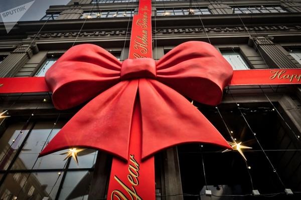 Chiếc nơ lớn màu đỏ biến cả cửa hàng bách hóa trung tâm TsUM trở thành một hộp quà khổng lồ, chờ đợi các khách hàng đến mở.