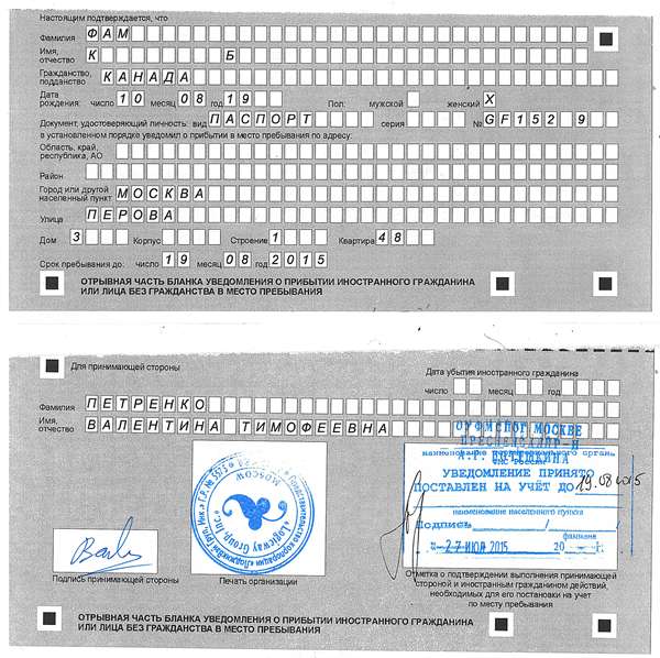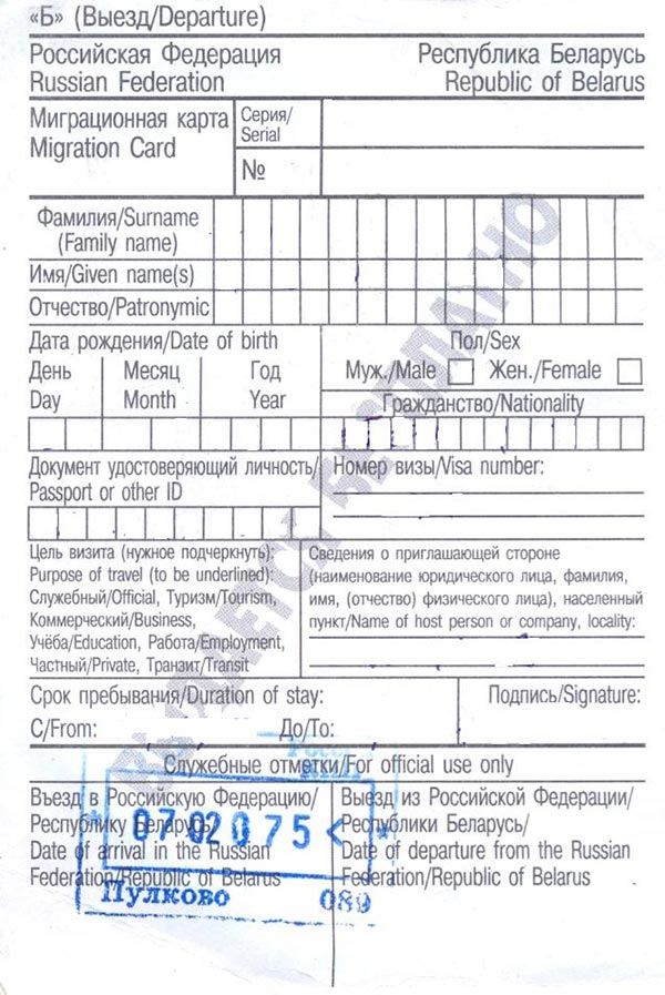 Khi vào cửa khẩu Nga, tại cửa biên phòng, mỗi người sẽ được phát một tờ nhập cảnh có đóng giấu của cơ quan biên phòng cùng với ngày tháng năm vào Nga và tên cửa khẩu. Trên cơ sở tờ nhập cảnh thì mới đăng ký được tạm trú tạm vắng.