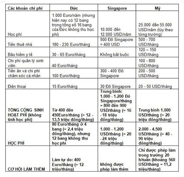 Thêm một so sánh chi tiết hơn về giá cả du học giữa các nước