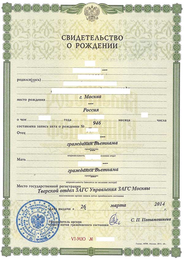 Mặt trước giấy khai sinh Nga