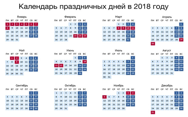 Như vậy, vào năm 2018 người lao động ở Nga sẽ được nghỉ Tết và Giáng sinh trong mười ngày kể từ 30/12/2017 đến 08/1/2018, ba ngày từ 23 – 25/2 (Ngày bảo vệ Tổ quốc), bốn ngày từ ngày 08 – 11/3(Ngày Quốc tế Phụ nữ), bốn ngày từ ngày 29/4 đến ngày 2/5 (Lễ hội mùa xuân và ngày Quốc tế Lao động), ngày lễ Chiến thắng sẽ chỉ có một ngày nghỉ - ngày 9/5, ba ngày nghỉ từ 10 – 12/6 (ngày Nước Nga) và ba ngày 3-5/11 (Ngày thống nhất các dân tộc).