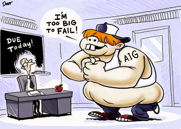 Too Big to Fail? hàng triệu căn nhà có thể bị kéo, hàng ngàn thuơng nghiệp sản xuất nhỏ có thể bị sụp, các công ty làm ăn tư nhân và tổ hợp có thể bị khai bankruptcy nhưng các tay tổ ngân hàng tại Wall Street khó chết vì đã là tài phiệt, khi hệ thống ngân hàng mà chết thì nền kinh tế Mỹ "chết" theo đó là những liên đới với toàn xã hội với cả một chính phủ đã lệ thuộc. Từ ý nghĩa đó năm 1984, dân biểu Mỹ Stewart McKinney đã dùng câu "too big to fail" để ám chỉ việc này tuy nhiên trước đó trong giới báo chí cũng có dùng qua.