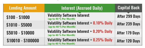 Hình thức Lending này gần giống với hoạt động ủy thác của các quỹ tài chính trên thế giới, huy động vốn của các nhà đầu tư và sẽ trả lãi hàng tháng, sau một khoảng thời gian nhất định thì nhà đầu tư có thể rút vốn của mình về. Tuy nhiên lãi suất của Bitconnect cao hơn rất nhiều so với các quỹ ủy thác, dao động từ 30 - 40% một tháng.