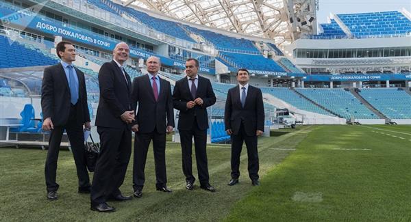 Tổng thống Nga và Chủ tịch FIFA Gianni Infantino đến kiểm tra SVĐ Fish ở Sochi ngày 3/5.