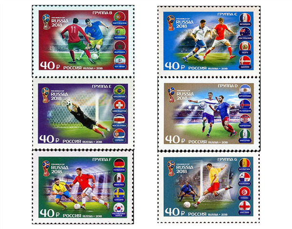 Trên mỗi con tem là một bảng gồm 4 đội tuyển dự World Cup 2018 cùng với hình ảnh cờ hiệu của đội tuyển quốc gia, biểu tượng World Cup.