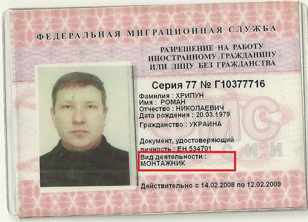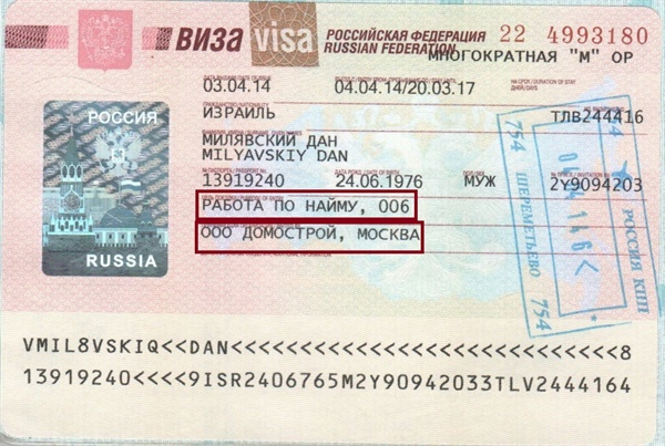 Visa cho thấy người này làm việc tại công ty Домострой, Москва - nếu khi cơ quan di trú kiểm tra mà không đúng như trên visa có nghĩa là người này vi phạm pháp luật (luật di trú)