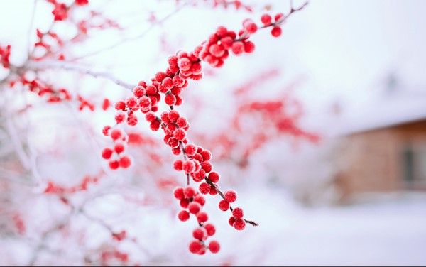 Quả thanh lương trà nổi bật tô điểm trên cành cây bọc tuyết trắng