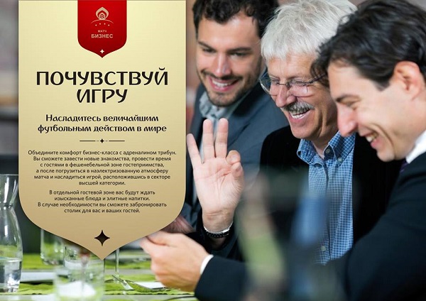 Với Hạng vé Hoàng gia bạn sẽ được ngồi xem trận thi đấu tại một vị trí tốt nhất dối diện chính giữa sân vận động. Bạn sẽ có thể quan sát trận đấu một cách thuận lợi nhất và không hề bị cản trở tầm nhìn bởi bất kì vấn đề phát sinh nào. Quý khách sẽ được phục vụ chu đáo từ những món ăn của Nga cho đến Quốc tế bởi các chuyên gia ẩm thực sành sỏi hàng đầu. Các bạn sẽ có đa dạng các sự lựa chọn đồ uống trước, trong và sau trận đấu với số lượng không giới hạn, được nhận những bộ quà tặng độc đáo và hơn hết là được phục vụ bởi các nữ tiếp viên chuyên nghiệp, duyên dáng. Ngoài ra khi đến xem các trận thi đấu, người sở hữu vé VIP còn sở hữu luôn một chỗ đậu xe ưu tiên, đây cũng là một trong những điểm rất thuận tiện khi đến xem tại những sân vận động đông đúc.