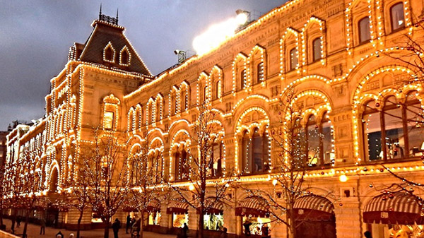 Tới thăm thủ đô Moskva du khách có cơ hội ghé thăm trung tâm thương mại Quốc gia GUM được xây dựng giống lâu đài cổ kinh từ thế kỷ 19. Trung tâm thương mại GUM với những gian hàng sang trọng như Dior, Chanel, Givenchi, Versace, BVLGARI, OMEGA… luôn là một điểm đến thu hút rất nhiều du khách khi đến với nước Nga. Mỗi khi đến mùa giảm giá các món hàng hiệu chất lượng đến được tay người mua với mức giá thấp hơn từ 30 – 70%, luôn làm nức lòng giới mộ điệu thời trang từ nhiều nơi trên thế giới.