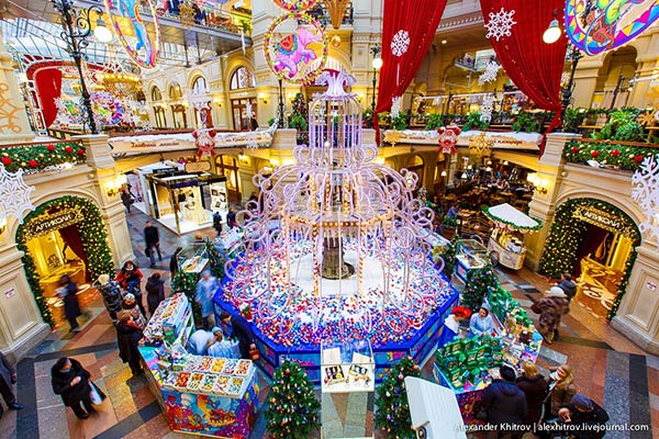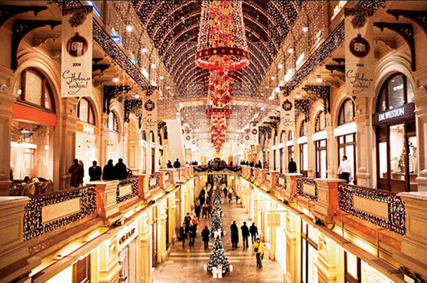 Mùa đông nước Nga không chỉ hấp dẫn du khách bởi vẻ đẹp hấp dẫn cảnh vật, mà ngay cả bên trong các nhà hàng, khách sạn đặc biệt là trong các trung tâm thương mại, mua sắm và giải trí cũng được trang hoàng rực rỡ, hoành tráng với những sắc màu lung linh và những hình thù được cắt ghé tỉ mỉ, trang trí sinh động và đẹp đẽ. Nước Nga giàu có là một trong những trung tâm thương mại lớn nhất Châu Âu, tại nơi đây, du khách có thể tìm thấy cho mình đủ mọi thứ từ quần áo, giày dép, cho đến mỹ phẩm, nước hoa, đồ trang sức…của đủ mọi nhãn hàng từ bình dân cho tới cao cấp trên toàn thế giới. Thêm vào đó, cứ vào cuối năm là thời điểm các nhãn hàng đồng loạt giảm giá từ 30 – 80%. Đó thực sự là cơ hội tốt cho du khách được thỏa sức mua sắm tất cả các nhãn hàng với mức giá rẻ đến bất ngờ.