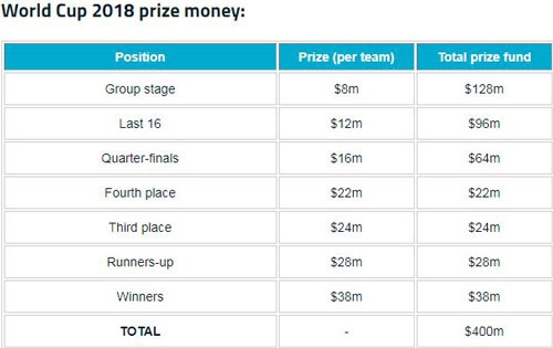 Đội bóng á quân World Cup 2018 sẽ kiếm được 28 triệu USD, cao hơn 3 triệu USD sơ với giải đấu tại Brazil cách đây 4 năm. Đội vô địch sẽ “bỏ túi” 38 triệu USD, cao hơn 3 triệu USD so với mức cũ.