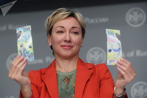 Phó thống đốc đầu tiên của Ngân hàng trung ương Nga, bà Olga Skorobogatova giới thiệu những tờ tiền giấy được in kỷ niệm World Cup FIFA 2018.