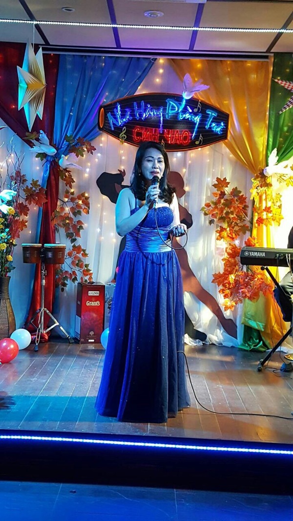 Chị Tâm, vợ anh Nam chủ nhà hàng Xin Chào tham gia biểu diễn