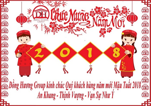 Chỉ còn vài giờ nữa là năm cũ Định Dậu sẽ kết thúc, năm mới Mậu Tuất 2018 đang đến trước cửa. Hoà cùng không khí vui xuân, mừng năm mới của mọi người, mọi nhà, thay mặt Ban lãnh đạo cùng toàn thể nhân viên ĐỒNG HƯƠNG GROUP, tôi xin gửi tới Quý khách hàng, Quý đối tác cùng toàn thể gia đình những lời chúc mừng năm mới. Chúc quý khách một năm mới AN KHANG THỊNH VƯỢNG – VẠN SỰ NHƯ Ý.