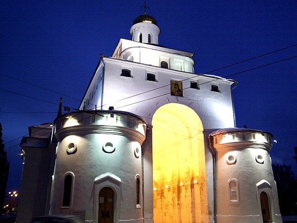 "Cổng Vàng" (Золотые ворота) là di tích đầu tiên mà các du khách nhìn thấy khi tiến vào thành phố Vladimir. Được xây dựng bằng những phiến đá đẽo hình hộp trắng toát, "Cổng Vàng” là điển hình hiếm hoi về kiến trúc thành trì phòng thủ của Nga trong thế kỷ 12. Trong diện mạo của nó hàm chứa mấy ý nghĩa: là cổng vòm khải hoàn, tháp chiến đấu và nhà thờ cửa khẩu. Cùng với “Cổng Vàng” hay nói đúng hơn là với việc kiến thiết xây dựng nó, gắn liền một truyền thuyết kỳ lạ. Tương truyền, cổng được xây dựng theo sắc chỉ của Quận vương Andrei Bogoliubsko, và khi công trình hoàn thành, bắt đầu tháo dỡ dàn giáo thì bất ngờ chiếc cổng vòm không có gì chống đỡ bỗng đổ sập xuống. Mười hai người thợ nằm dưới đống đổ nát. Tất cả đều nghĩ rằng họ đã tử nạn. Nhưng Quận vương Andrei quì xuống bắt đầu cầu nguyện xin Đức Mẹ cứu mạng những con người tội nghiệp. Khi các mảng đất đá được tháo dỡ dân chúng thấy rằng những người thợ bị chôn vùi bên dưới không những sống sót, mà còn chẳng hề bị bất kỳ thương tích nghiêm trọng nào. Sau sự việc này, Quận vương ra lệnh dựng một nhà thờ phía trên cổng để tạ ơn Thánh Mẫu.
